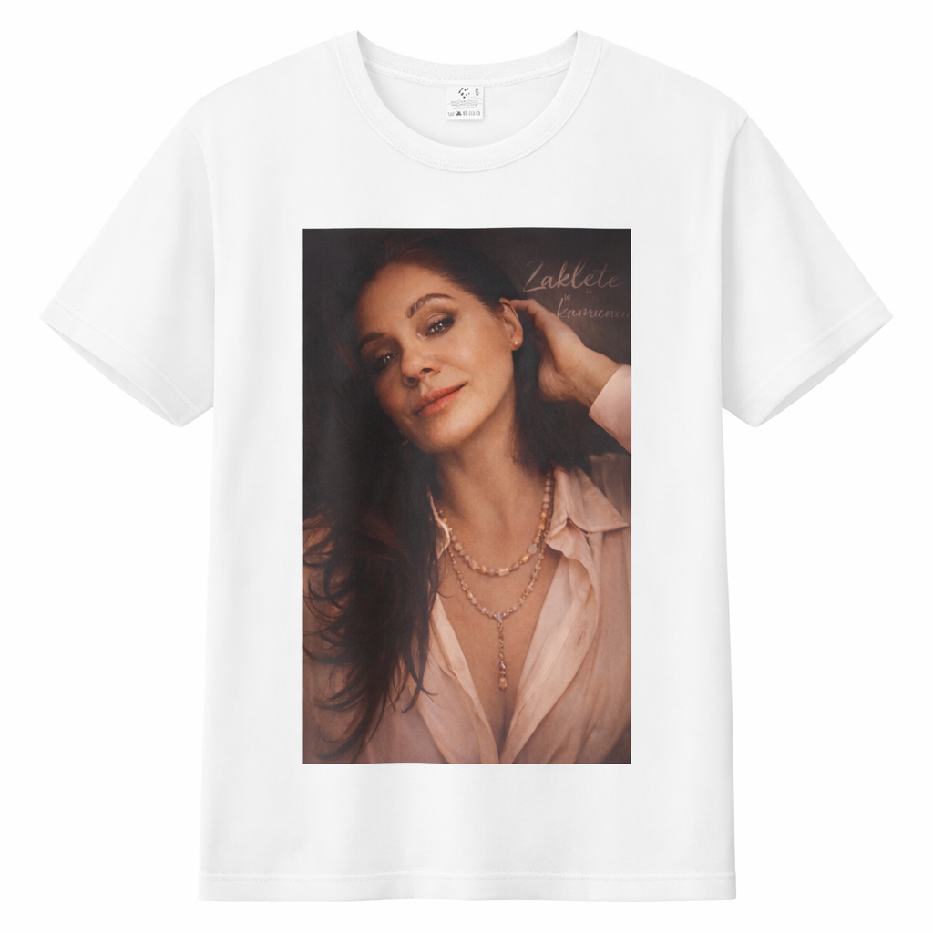 Biała koszulka wykonana w 100% z poliestru z autorską grafiką nawiązującą do rozpoznawalnego stylu marki Jagoda Zink i linii biżuterii Zaklęte w kamieniu. To wyjątkowy produkt dla osób, które chcą nosić ze sobą estetykę marki i jej charakterystyczny klimat.